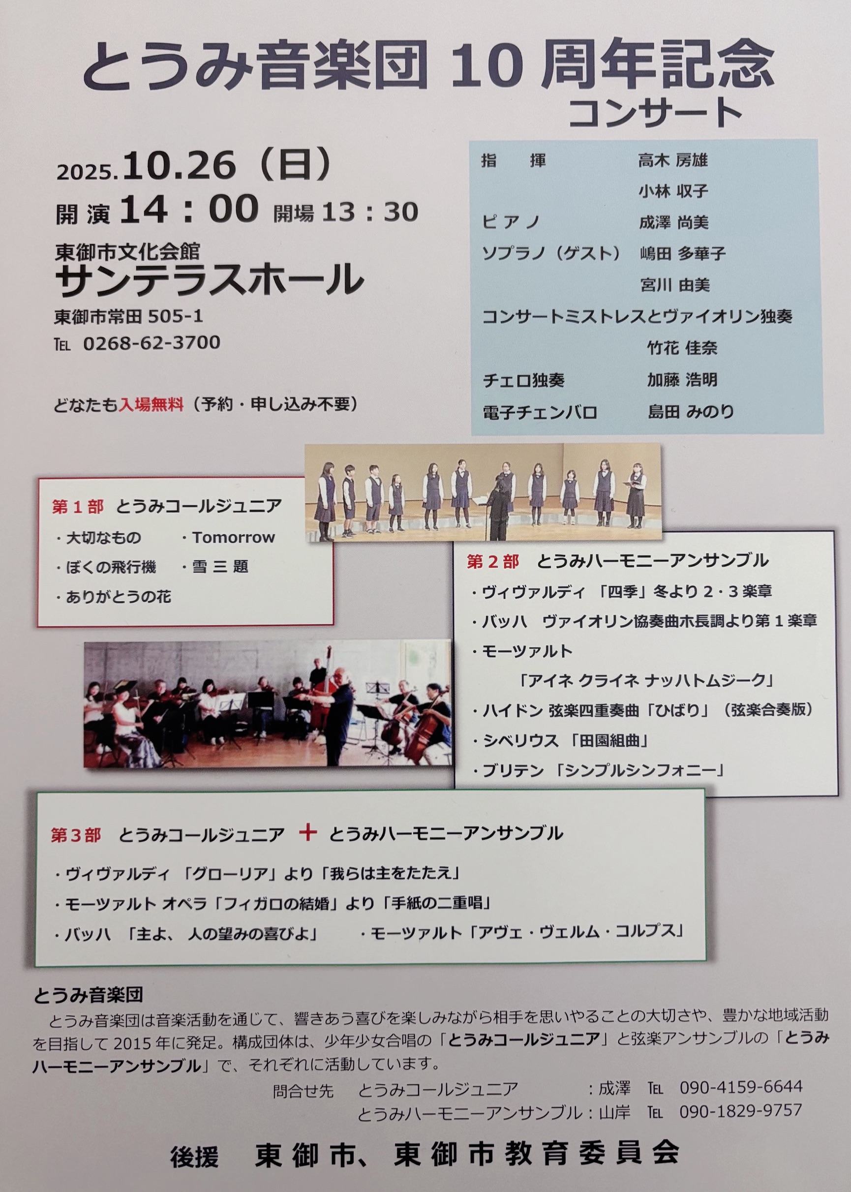 来る10月26日 東御市文化会館 サンテラスホールにて とうみ音楽団 10周年記念コンサートが開催され、