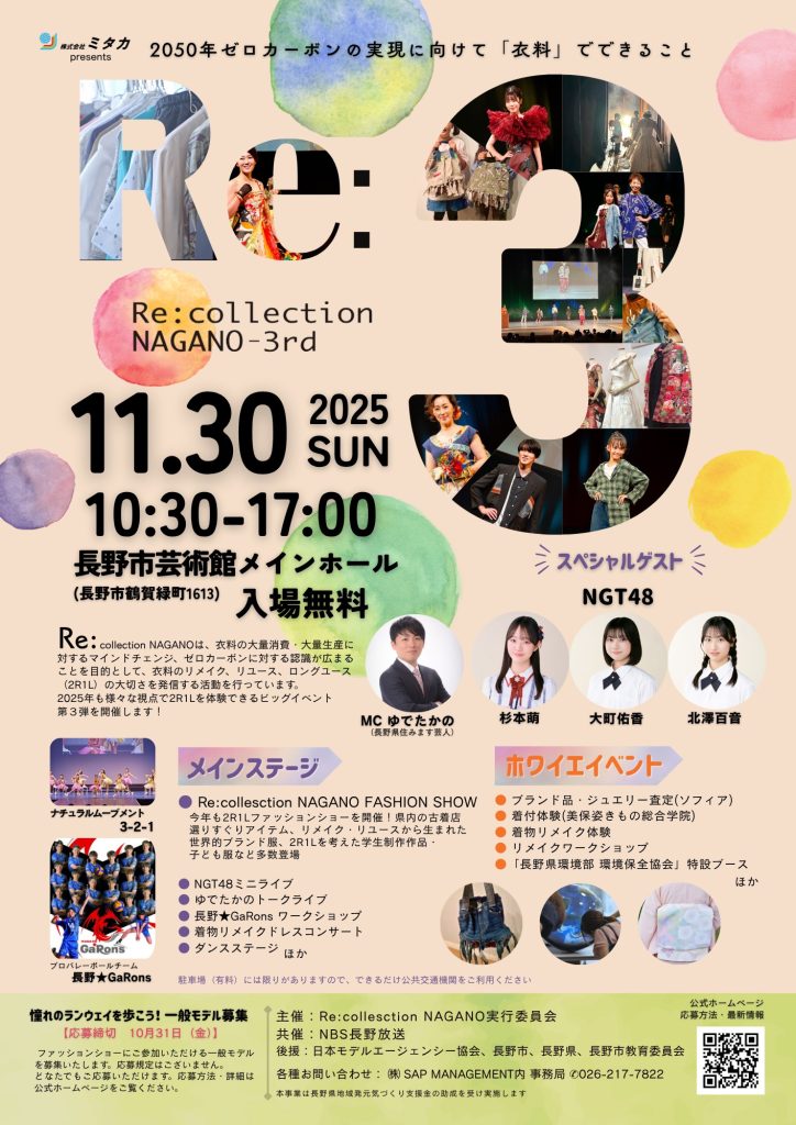 来る11月30日(日)長野市芸術館メインホールに於きまして、Re:Collection NAGANO-3rd 衣料の大量消費生産に対するマインドチェンジ、ゼロカーボンに対する認識が広まることを目的としたイベントが開催されます。衣料のリメイク、リユース、ロングユースの大切さを発信する活動をメインステージにて様々な団体が参加し、私は着物リメイクドレスのステージにて出演させて頂きます♪ リメイク・リユースにご関心のある方はもちろん、入場無料となっておりますので、どうぞお気軽にご来場頂けたら幸いです♪